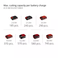Graphic: Max. cutting capacity per battery charge, round timber Ø 35 mm, 1 x 2,0 Ah - 185 pcs., 1 x 2,5 Ah - 240 pcs., 1 x 3,0 Ah - 290 pcs., 1 x 4,0 Ah - 370 pcs., 1 x 5,2 Ah - 570 pcs., 1 x 6,0 Ah - 580 pcs., 1 x 8,0 Ah - 740 pcs.